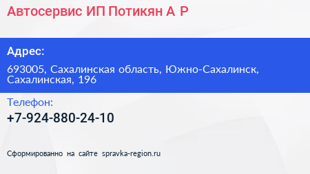 Автосервис, ИП Потикян А.Р. по адресу 693005, Сахалинская область, Южно-Сахалинск, Сахалинская, 196 в дальнейшем Организация, размещена в следующих категориях:
