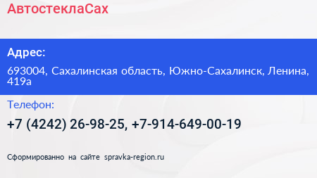 АвтостеклаСах по адресу 693004, Сахалинская область, Южно-Сахалинск, Ленина, 419а в дальнейшем Организация, размещена в следующих категориях: