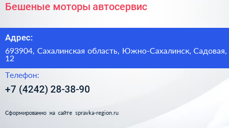 Бешеные моторы, автосервис по адресу 693904, Сахалинская область, Южно-Сахалинск, Садовая, 12 в дальнейшем Организация, размещена в следующих категориях: