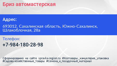 Бриз, автомастерская по адресу 693012, Сахалинская область, Южно-Сахалинск, Шлакоблочная, 28а в дальнейшем Организация, размещена в следующих категориях: