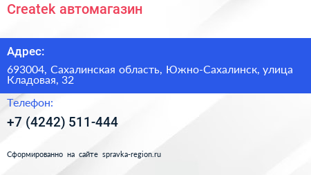Createk, автомагазин по адресу 693004, Сахалинская область, Южно-Сахалинск, улица Кладовая, 32 в дальнейшем Организация, размещена в следующих категориях: