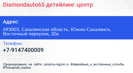 Diamondauto65, детейлинг - центр по адресу 693003, Сахалинская область, Южно-Сахалинск, Восточный переулок, 20а в дальнейшем Организация, размещена в следующих категориях: