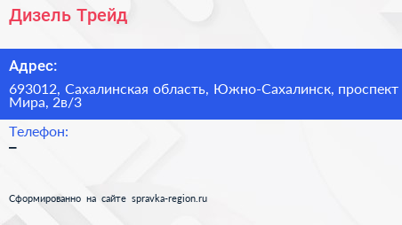 Дизель-Трейд по адресу 693012, Сахалинская область, Южно-Сахалинск, проспект Мира, 2в/3 в дальнейшем Организация, размещена в следующих категориях: