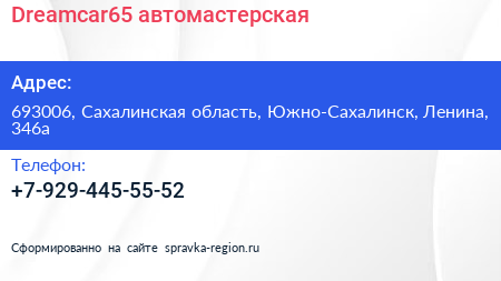 Dreamcar65, автомастерская по адресу 693006, Сахалинская область, Южно-Сахалинск, Ленина, 346а в дальнейшем Организация, размещена в следующих категориях: