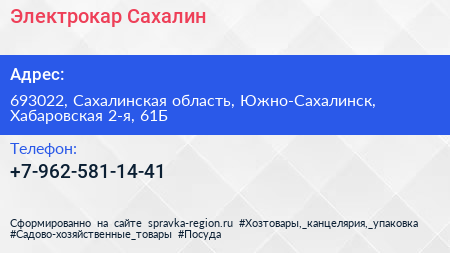 Электрокар Сахалин по адресу 693022, Сахалинская область, Южно-Сахалинск, Хабаровская 2-я, 61Б в дальнейшем Организация, размещена в следующих категориях: