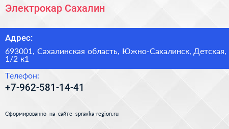 Электрокар Сахалин по адресу 693001, Сахалинская область, Южно-Сахалинск, Детская, 1/2 к1 в дальнейшем Организация, размещена в следующих категориях: