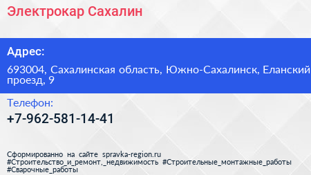 Электрокар Сахалин по адресу 693004, Сахалинская область, Южно-Сахалинск, Еланский проезд, 9 в дальнейшем Организация, размещена в следующих категориях: