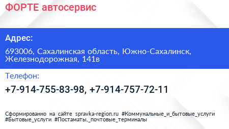 ФОРТЕ, автосервис по адресу 693006, Сахалинская область, Южно-Сахалинск, Железнодорожная, 141в в дальнейшем Организация, размещена в следующих категориях: