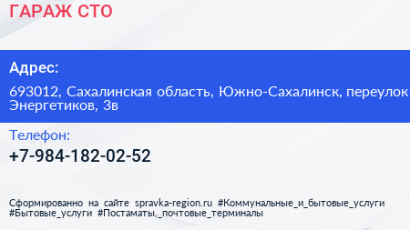 ГАРАЖ, СТО по адресу 693012, Сахалинская область, Южно-Сахалинск, переулок Энергетиков, 3в в дальнейшем Организация, размещена в следующих категориях: