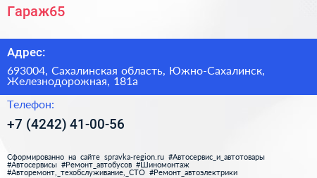 Гараж65 по адресу 693004, Сахалинская область, Южно-Сахалинск, Железнодорожная, 181а в дальнейшем Организация, размещена в следующих категориях: