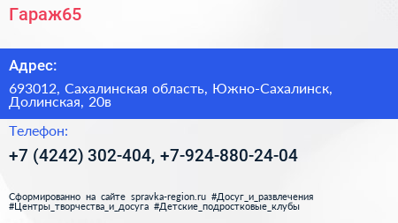 Гараж65 по адресу 693012, Сахалинская область, Южно-Сахалинск, Долинская, 20в в дальнейшем Организация, размещена в следующих категориях: