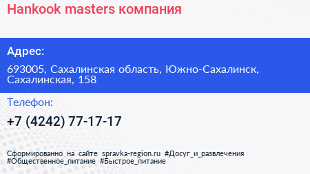 Hankook masters, компания по адресу 693005, Сахалинская область, Южно-Сахалинск, Сахалинская, 158 в дальнейшем Организация, размещена в следующих категориях:
