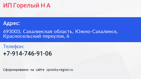 ИП Горелый Н.А. по адресу 693003, Сахалинская область, Южно-Сахалинск, Красносельский переулок, 6 в дальнейшем Организация, размещена в следующих категориях: