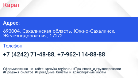 Карат по адресу 693004, Сахалинская область, Южно-Сахалинск, Железнодорожная, 172/2 в дальнейшем Организация, размещена в следующих категориях: