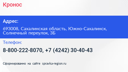 Кронос по адресу 693008, Сахалинская область, Южно-Сахалинск, Солнечный переулок, 3Б в дальнейшем Организация, размещена в следующих категориях: