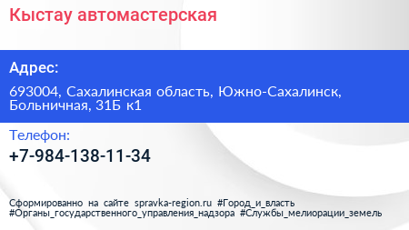 Кыстау, автомастерская по адресу 693004, Сахалинская область, Южно-Сахалинск, Больничная, 31Б к1 в дальнейшем Организация, размещена в следующих категориях: