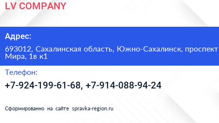 LV & COMPANY по адресу 693012, Сахалинская область, Южно-Сахалинск, проспект Мира, 1в к1 в дальнейшем Организация, размещена в следующих категориях: