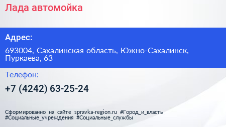 Лада, автомойка по адресу 693004, Сахалинская область, Южно-Сахалинск, Пуркаева, 63 в дальнейшем Организация, размещена в следующих категориях: