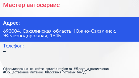 Мастер, автосервис по адресу 693004, Сахалинская область, Южно-Сахалинск, Железнодорожная, 164Б в дальнейшем Организация, размещена в следующих категориях:
