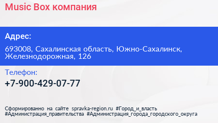 Music Box, компания по адресу 693008, Сахалинская область, Южно-Сахалинск, Железнодорожная, 126 в дальнейшем Организация, размещена в следующих категориях: