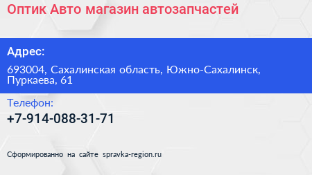 Оптик Авто, магазин автозапчастей по адресу 693004, Сахалинская область, Южно-Сахалинск, Пуркаева, 61 в дальнейшем Организация, размещена в следующих категориях: