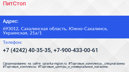 ПитСтоп по адресу 693012, Сахалинская область, Южно-Сахалинск, Украинская, 21а/1 в дальнейшем Организация, размещена в следующих категориях: