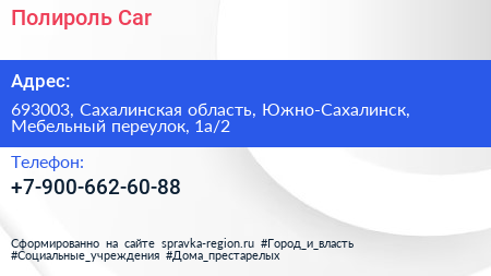 Полироль Car по адресу 693003, Сахалинская область, Южно-Сахалинск, Мебельный переулок, 1а/2 в дальнейшем Организация, размещена в следующих категориях: