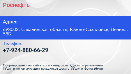 Роснефть по адресу 693003, Сахалинская область, Южно-Сахалинск, Ленина, 58Б в дальнейшем Организация, размещена в следующих категориях:
