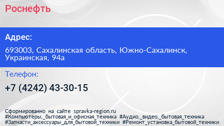 Роснефть по адресу 693003, Сахалинская область, Южно-Сахалинск, Украинская, 94а в дальнейшем Организация, размещена в следующих категориях: