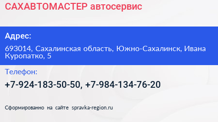САХАВТОМАСТЕР, автосервис по адресу 693014, Сахалинская область, Южно-Сахалинск, Ивана Куропатко, 5 в дальнейшем Организация, размещена в следующих категориях: