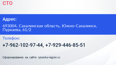 СТО по адресу 693004, Сахалинская область, Южно-Сахалинск, Пуркаева, 61/2 в дальнейшем Организация, размещена в следующих категориях: