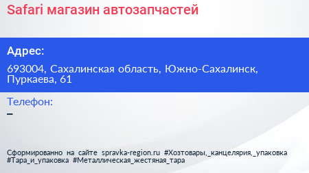 Safari, магазин автозапчастей по адресу 693004, Сахалинская область, Южно-Сахалинск, Пуркаева, 61 в дальнейшем Организация, размещена в следующих категориях: