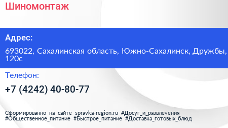 Шиномонтаж по адресу 693022, Сахалинская область, Южно-Сахалинск, Дружбы, 120с в дальнейшем Организация, размещена в следующих категориях: