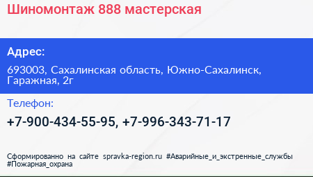 Шиномонтаж 888, мастерская по адресу 693003, Сахалинская область, Южно-Сахалинск, Гаражная, 2г в дальнейшем Организация, размещена в следующих категориях: