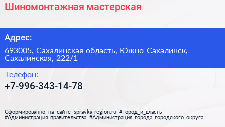 Шиномонтажная мастерская по адресу 693005, Сахалинская область, Южно-Сахалинск, Сахалинская, 222/1 в дальнейшем Организация, размещена в следующих категориях: