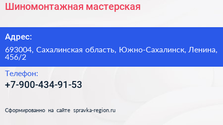 Шиномонтажная мастерская по адресу 693004, Сахалинская область, Южно-Сахалинск, Ленина, 456/2 в дальнейшем Организация, размещена в следующих категориях: