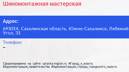 Шиномонтажная мастерская по адресу 693014, Сахалинская область, Южно-Сахалинск, Лебяжий Угол, 31 в дальнейшем Организация, размещена в следующих категориях: