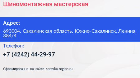 Шиномонтажная мастерская по адресу 693004, Сахалинская область, Южно-Сахалинск, Ленина, 384/4 в дальнейшем Организация, размещена в следующих категориях: