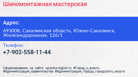 Шиномонтажная мастерская по адресу 693008, Сахалинская область, Южно-Сахалинск, Железнодорожная, 126/1 в дальнейшем Организация, размещена в следующих категориях: