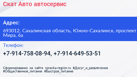 Скат Авто, автосервис по адресу 693012, Сахалинская область, Южно-Сахалинск, проспект Мира, 6а в дальнейшем Организация, размещена в следующих категориях: