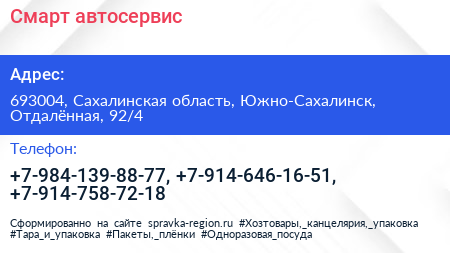 Смарт, автосервис по адресу 693004, Сахалинская область, Южно-Сахалинск, Отдалённая, 92/4 в дальнейшем Организация, размещена в следующих категориях: