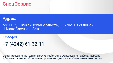 СпецСервис по адресу 693012, Сахалинская область, Южно-Сахалинск, Шлакоблочная, 34в в дальнейшем Организация, размещена в следующих категориях: