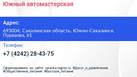 Южный, автомастерская по адресу 693004, Сахалинская область, Южно-Сахалинск, Пуркаева, 61 в дальнейшем Организация, размещена в следующих категориях: