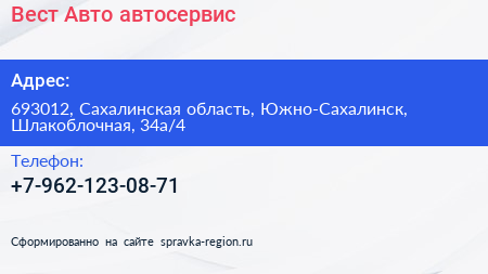 Вест Авто, автосервис по адресу 693012, Сахалинская область, Южно-Сахалинск, Шлакоблочная, 34а/4 в дальнейшем Организация, размещена в следующих категориях: