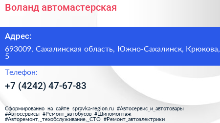 Воланд, автомастерская по адресу 693009, Сахалинская область, Южно-Сахалинск, Крюкова, 5 в дальнейшем Организация, размещена в следующих категориях: