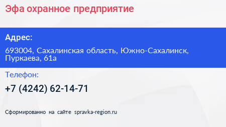 Эфа, охранное предприятие по адресу 693004, Сахалинская область, Южно-Сахалинск, Пуркаева, 61а в дальнейшем Организация, размещена в следующих категориях: