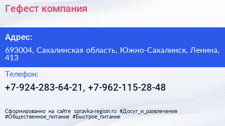 Гефест, компания по адресу 693004, Сахалинская область, Южно-Сахалинск, Ленина, 413 в дальнейшем Организация, размещена в следующих категориях: