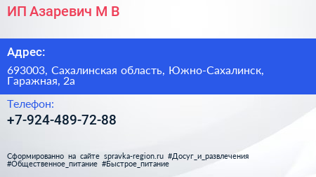 ИП Азаревич М.В. по адресу 693003, Сахалинская область, Южно-Сахалинск, Гаражная, 2а в дальнейшем Организация, размещена в следующих категориях: