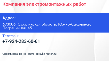 Компания электромонтажных работ по адресу 693006, Сахалинская область, Южно-Сахалинск, Пограничная, 45 в дальнейшем Организация, размещена в следующих категориях: