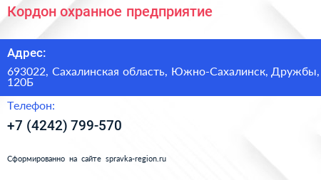 Кордон, охранное предприятие по адресу 693022, Сахалинская область, Южно-Сахалинск, Дружбы, 120Б в дальнейшем Организация, размещена в следующих категориях: